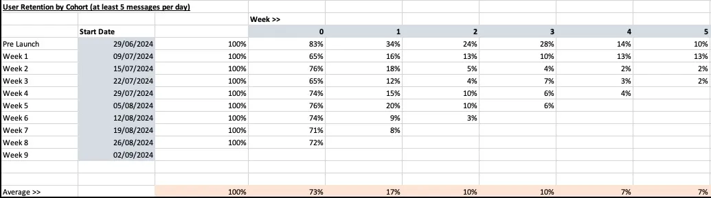 * D1: 73% have intent and actually tries (sends >5 msgs)