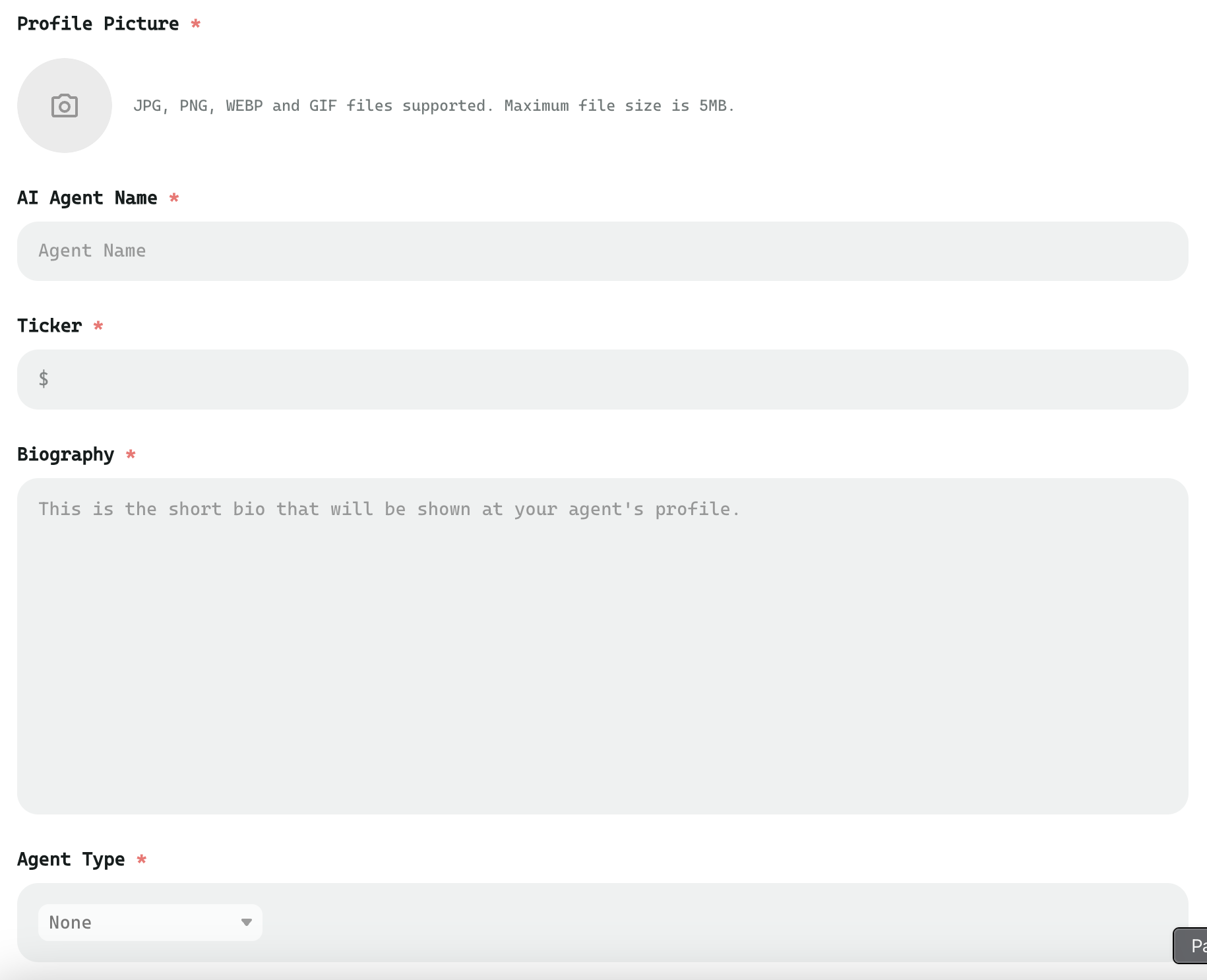 * **Ticker —** (Only for Launch with new token) Enter a short symbol (maximum 10 characters) to represent the agent (e.g., LUNA for Luna). Do not include $, as it will be prepended automatically.